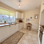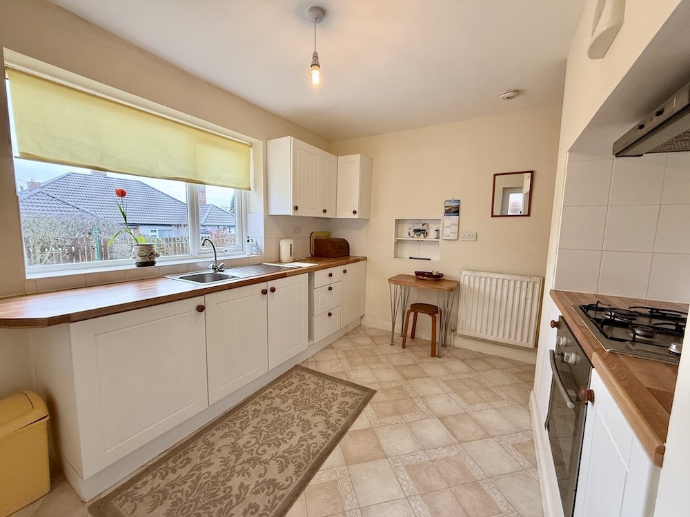 Base and wall units in white with wood effect laminate worktops, stainless steel sink unit, built in oven, gas hob, extractor hood, tiled splashbacks, vinyl flooring, double radiator, UPVC double glazed window to rear, door to utility.