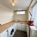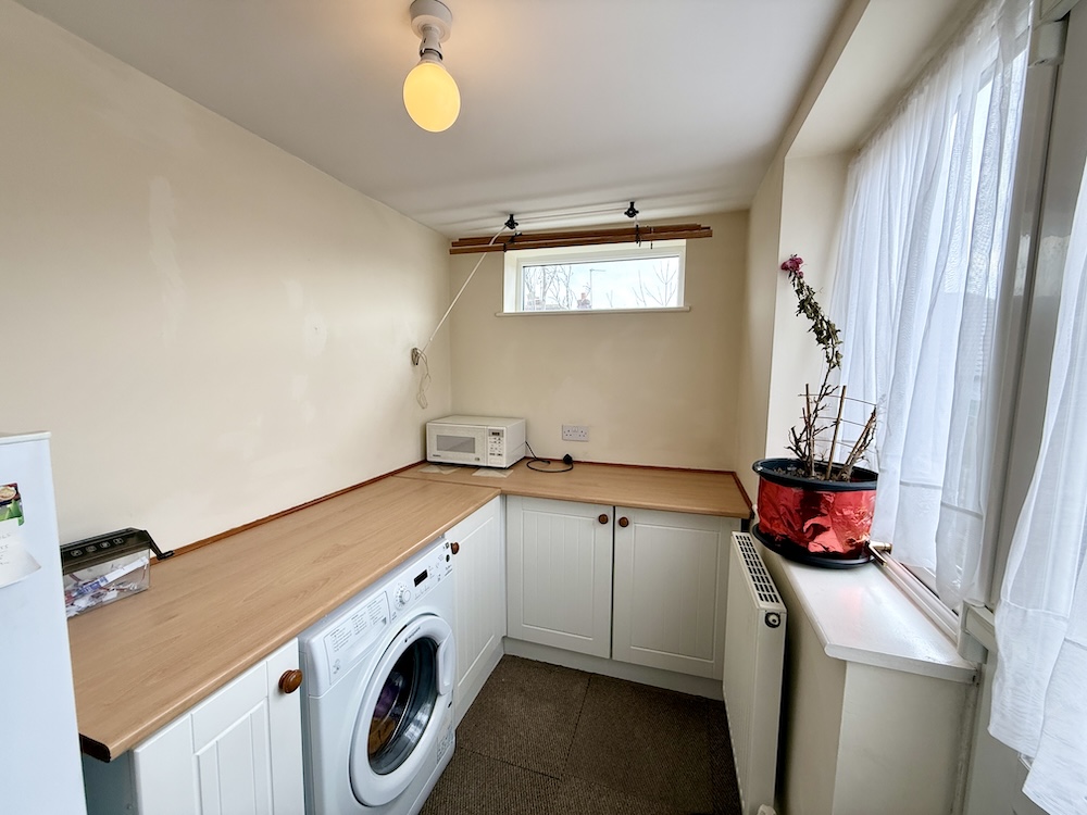 Base and wal units in white, beech laminate worktops, plumbed for washing machine, UPVC window and door to rear garden.
