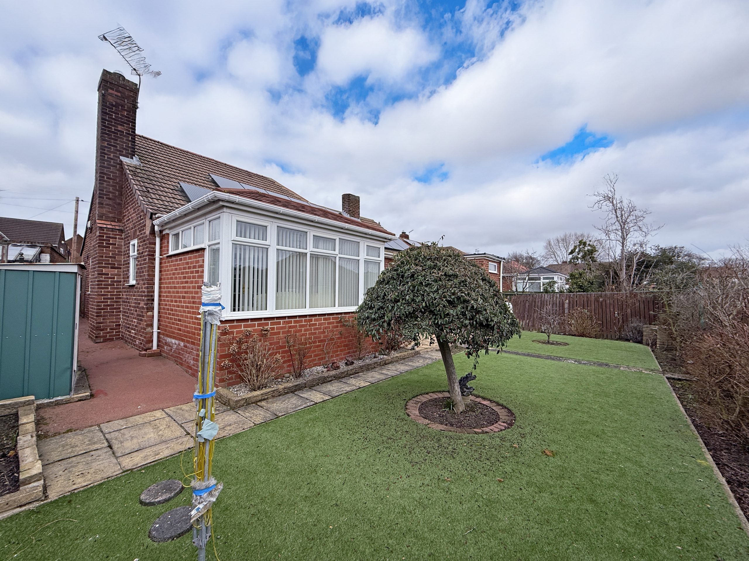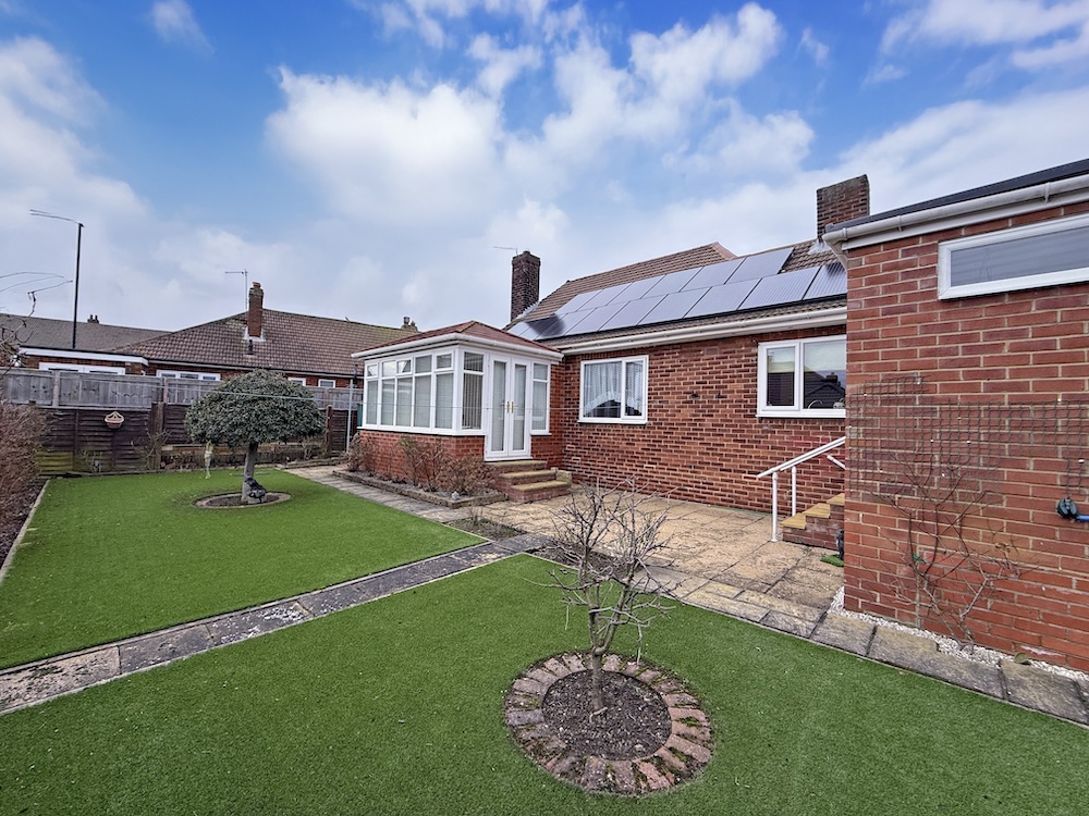 Drive on parking to garage, paved area, artificial grass area. Paved area to rear with artificial grass, Victoria plum tree, 2 dwarf apple trees, pear tree, fencing.