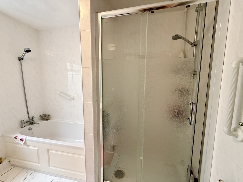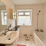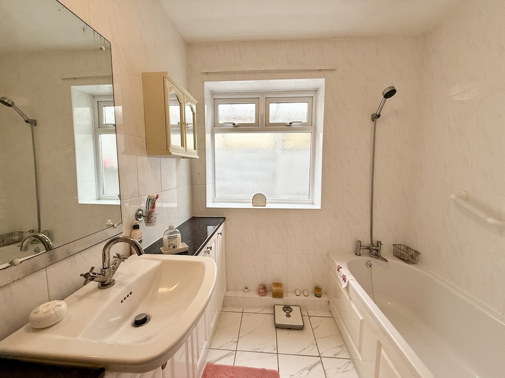 Panelled bath, mixer shower over bath, separate shower cubicle with power shower, vanity basin with gloss white doors and drawers, tiled to all walls, tiled flooring, UPVC double glazed window to side, single radiator.